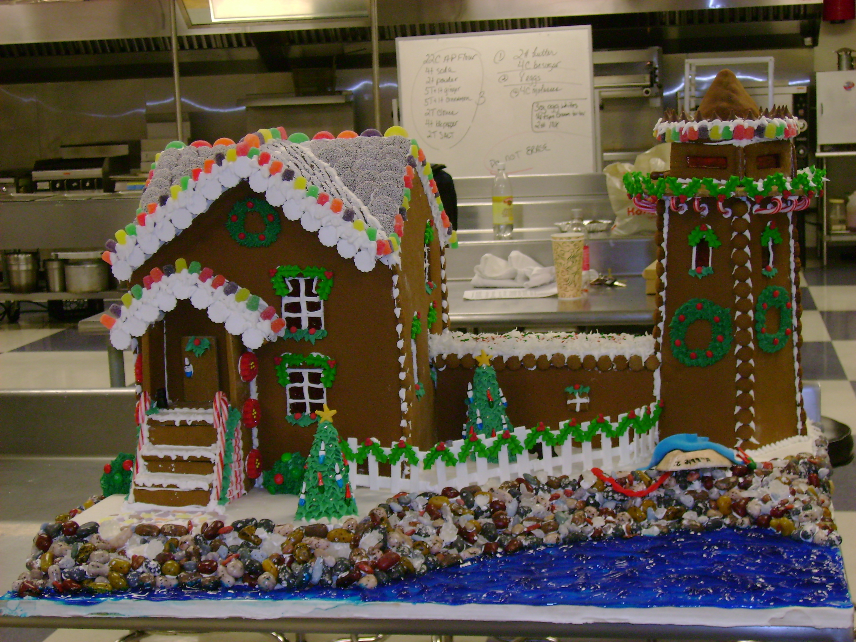 The first semester of culinary school can be a bit nerving. You have to learn about new instructors, meet other students and prepare for your hands on lab classes. What you’re not quite prepared for is the invitation for 5 students to compete in a gingerbread contest in New York City on Broadway known as The Gingerbread on Broadway at the Marriott Marquis . It gets better. These are 5 students who have never baked a cookie, rolled a rolling-pin across a sheet of gingerbread let alone 120 sheets of gingerbread, used a commercial convection oven or a 30qt. Hobart mixer…until now. This gingerbread house had to be made entirely out of edible products. How hard can that be?? Read on…